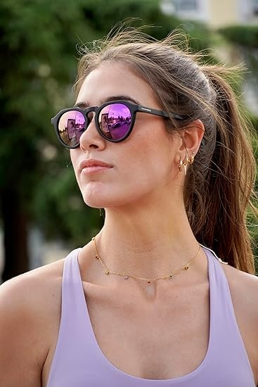 - Polarized sunglasses: Reduces surface reflections and eye fatigue, providing superior sharpness and contrast, Sunglasses category 3 filter, dark colouring, suitable for full sun outdoors, Absorb 82-92 Percent sunlight, Lens material: Lenses made of polarised bio tac material, 100 Percent UV protection, Lens Color: Purple, Lens Appearance: Mirror