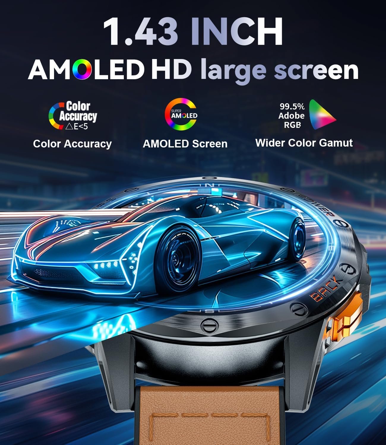 - Premium Design with AMOLED Brilliance: Crafted with durable stainless steel, a leather strap, and a magnetic buckle, this smartwatch combines rugged durability with modern fashion. The 1.43-inch AMOLED screen delivers vivid visuals, making every glance sharp and stylish. Effortlessly check the time with a simple raise of your wrist—no need to press any buttons