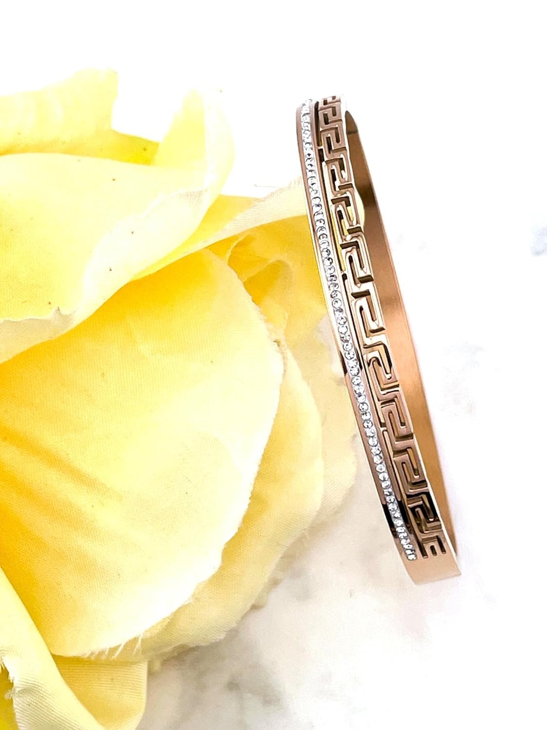 - 🏺 5mm Handmade Greek Key Meander Bracelet Bangle. Exquisite jewelry piece marrying the Ancient symbolism of contemporary Luxury creating a versatile yet stunning accessory that will elevate one’s style to new heights. HAND CRAFTED with meticulous care Vermeil GOLD layer of 18k White GOLD OVER Silver imparting a lustrous warm piece jewelry. The brilliance of the GOLD serving as a perfect backdrop for sparkle and captivating brilliance formed by the bracelet’s Handset 58 Austrian crystal DIAMOND
