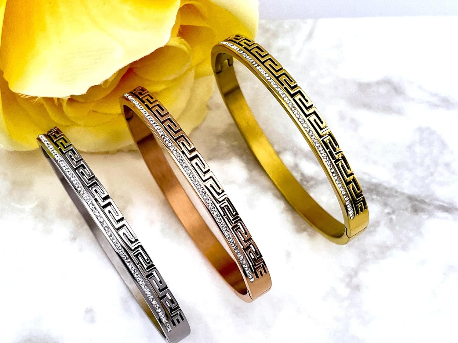 - 🏺 A gracing piece carrying historical significance.The 5mm wide Greek Key Meander design clip closure bracelet symbolises unity, eternal health, eternal happiness, eternal prosperit and infinite life. A Classic motif which has endured throughout history making this Meander Key bracelet design not only a stunning fashion statement but a talisman of deeper meaning.