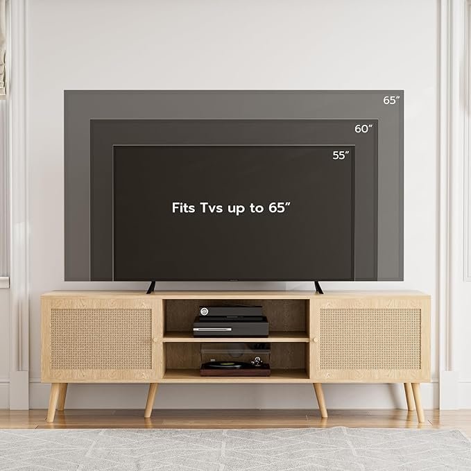 TV Stand for TVs up to 65”, Entertainment Center with Rattan Door